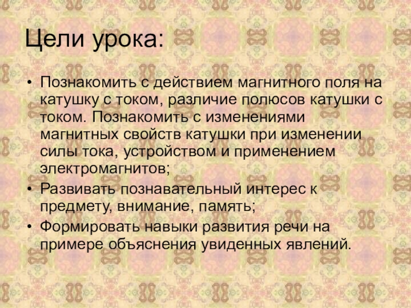 катушки при изменении силы тока, устройством и применением электромагнитов;Развивать познавательный интерес к предмету, внимание, память;