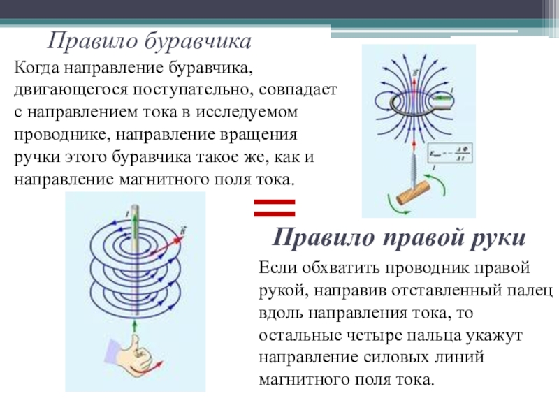 Если обхватить проводник правой рукой, направив отставленный палец вдоль направления тока, то остальные четыре пальца укажут направление силовых линий магнитного поля тока.