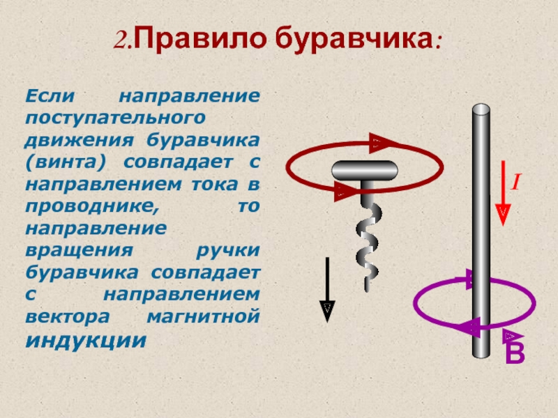 тока в проводнике, то направление вращения ручки буравчика совпадает с