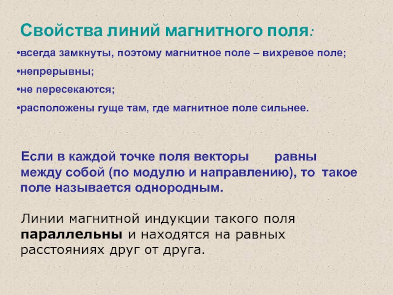 Линии магнитной индукции такого поля параллельны и находятся на равных расстояниях друг от друга.