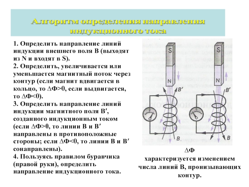 2. Определить, увеличивается или уменьшается магнитный поток через контур (если магнит вдвигается в кольцо, то ∆Ф>0, если выдвигается, то ∆Ф<0).