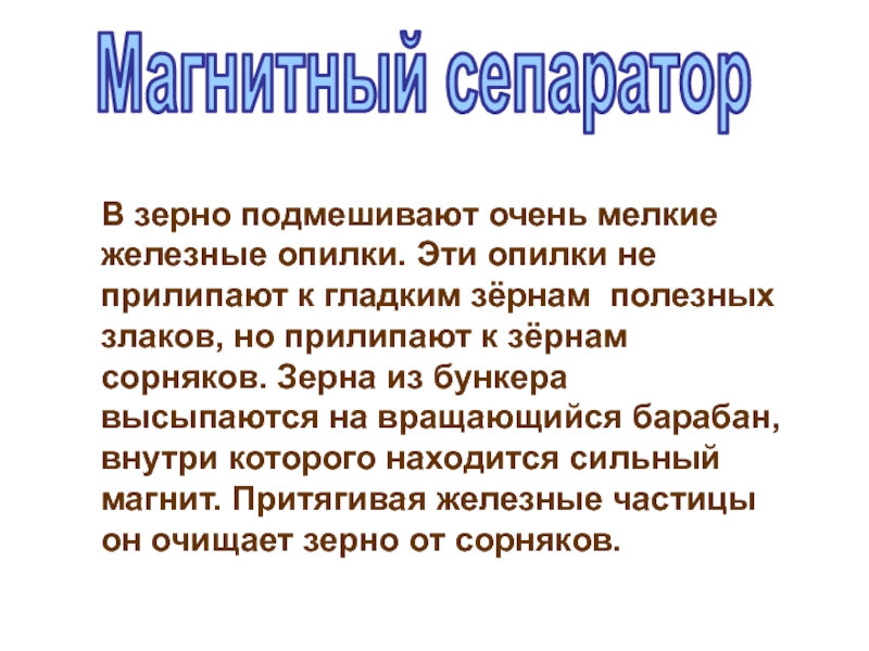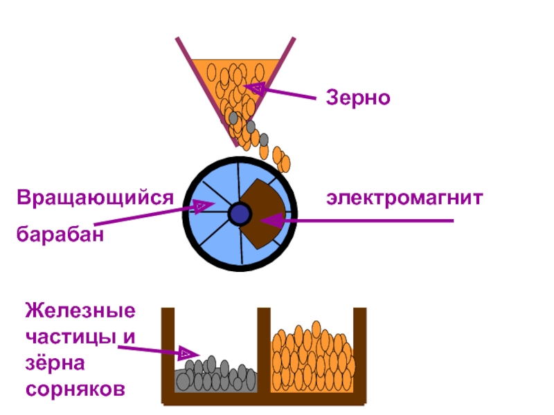 зёрнам сорняков. Зерна из бункера высыпаются на вращающийся барабан, внутри которого находится сильный магнит. Притягивая железные частицы он очищает зерно от сорняков.
