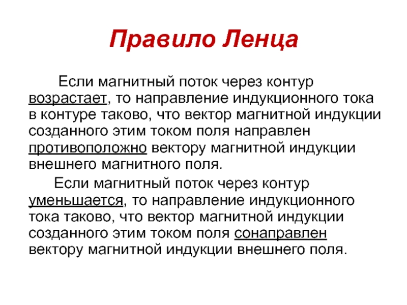 Если магнитный поток через контур уменьшается, то направление индукционного тока таково, что вектор магнитной индукции созданного этим током поля сонаправлен вектору магнитной индукции внешнего поля.