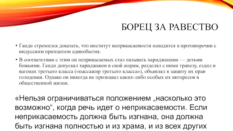 «Нельзя ограничиваться положением „насколько это возможно“, когда речь идет о неприкасаемости. Если неприкасаемость должна быть изгнана, она должна быть изгнана полностью и из храма, и из всех других сфер жизни».
