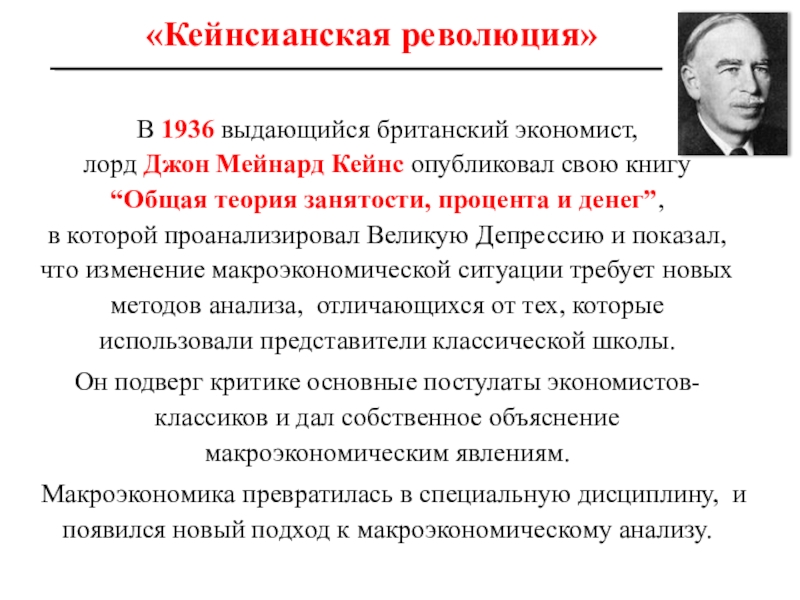 Вклад Кейнса в экономическую теорию был настолько велик, что его идеи получили название «Кейнсианской революции».