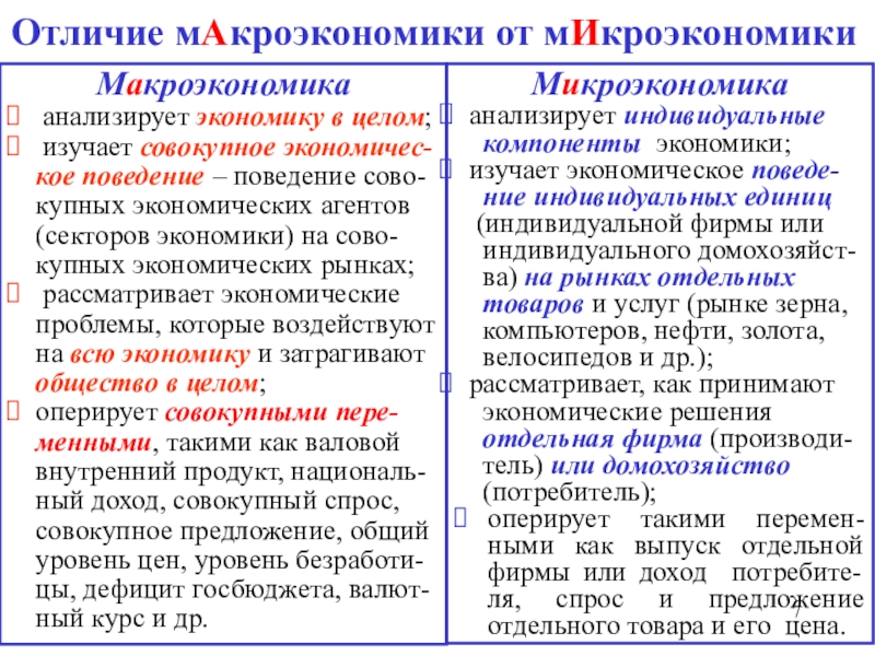 оперирует совокупными пере-менными, такими как валовой внутренний продукт, националь-ный доход, совокупный спрос, совокупное предложение, общий уровень цен, уровень безработи-цы, дефицит госбюджета, валют-ный курс и др.