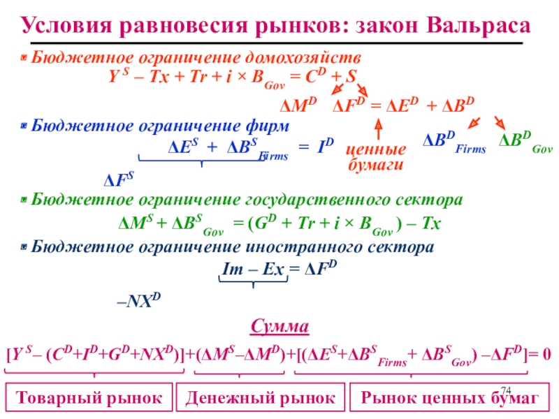 Слайд 74Условия равновесия рынков: закон Вальраса
