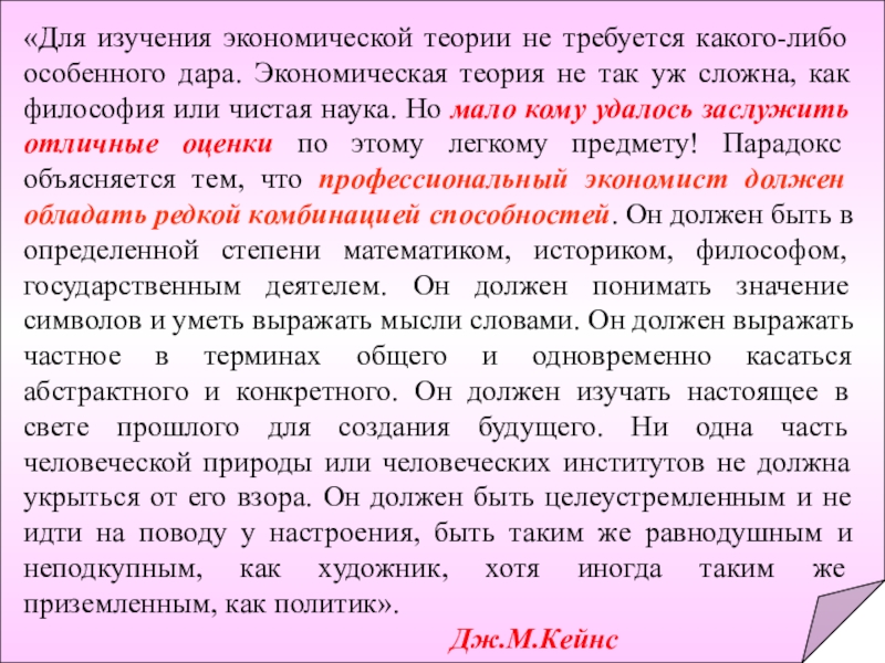Слайд 2«Для изучения экономической теории не требуется какого-либо особенного дара. Экономическая