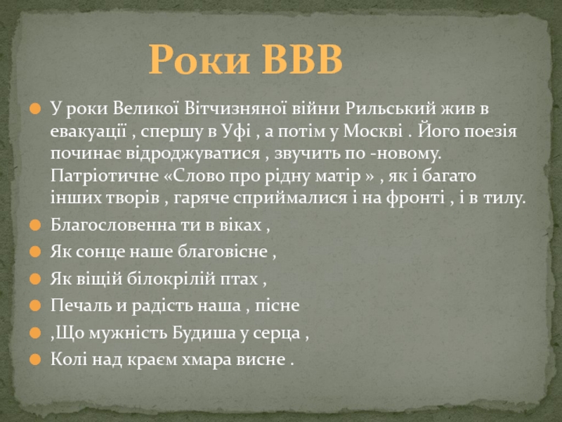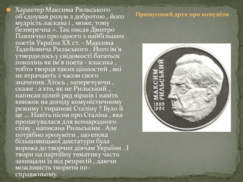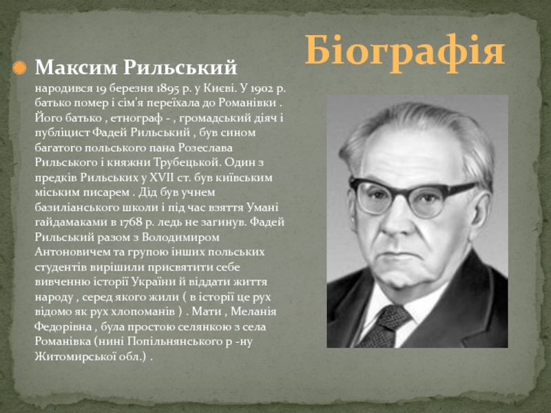 Його батько , етнограф - , громадський діяч і публіцист Фадей Рильський , був сином багатого польського пана Розеслава Рильського і княжни Трубецькой. Один з предків Рильських у XVII ст. був київським міським писарем . Дід був учнем базиліанського школи і під час взяття Умані гайдамаками в 1768 р. ледь не загинув. Фадей Рильський разом з Володимиром Антоновичем та групою інших польських студентів вирішили присвятити себе вивченню історії України й віддати життя народу , серед якого жили ( в історії це рух відомо як рух хлопоманів ) . Мати , Меланія Федорівна , була простою селянкою з села Романівка (нині Попільнянського р -ну Житомирської обл.) .Біографія