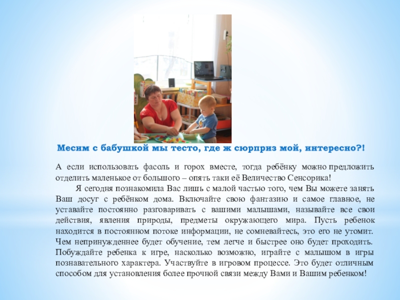 Итак, давайте немного поиграем! В глубокую ёмкость насыпаем фасоль и запускаем в неё руки и изображаем, как будто мы начинаем месить тесто, приговаривая: