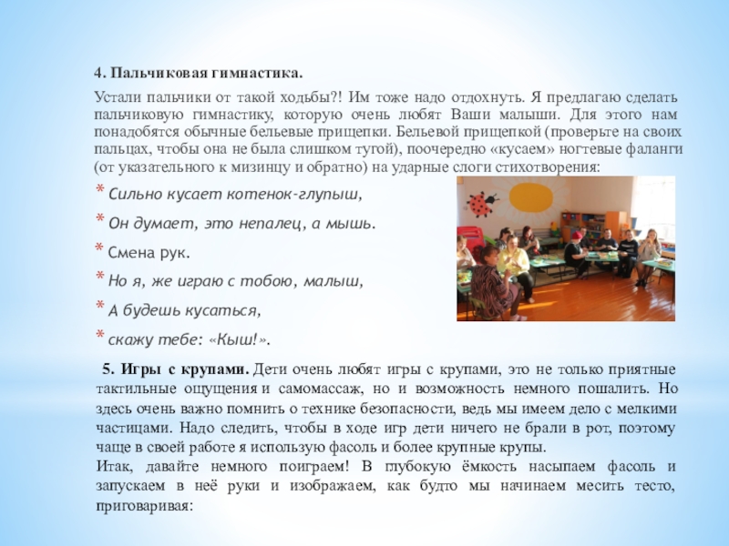 5. Игры с крупами. Дети очень любят игры с крупами, это не только приятные тактильные ощущения и самомассаж, но и возможность немного пошалить. Но здесь очень важно помнить о технике безопасности, ведь мы имеем дело с мелкими частицами. Надо следить, чтобы в ходе игр дети ничего не брали в рот, поэтому чаще в своей работе я использую фасоль и более крупные крупы.