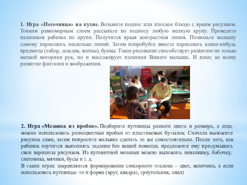В таких играх закрепляется формирование сенсорного эталона – цвет, величина, а если использовать пуговицы- то и форма (круг, квадрат, треугольник, овал)