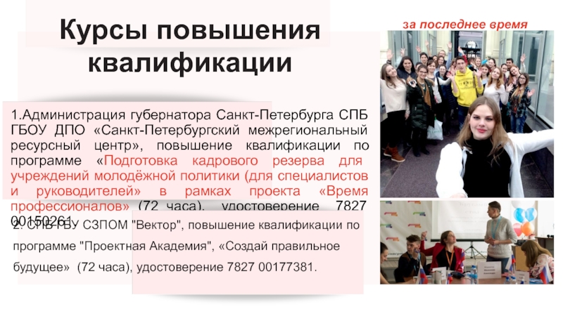 2. СПБ ГБУ СЗПОМ "Вектор", повышение квалификации по программе "Проектная Академия", «Создай правильное будущее» (72 часа), удостоверение 7827 00177381.