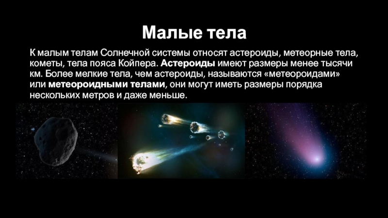 Слайд 1Малые тела Солнечной системы: астероиды, карликовые планеты, кометы