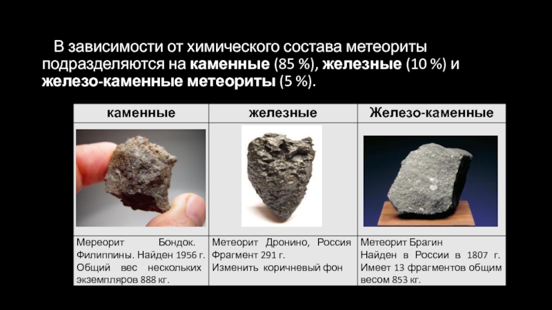 Слайд 16В зависимости от химического состава метеориты подразделяются на каменные (85 %),