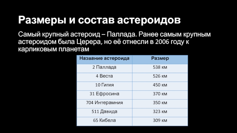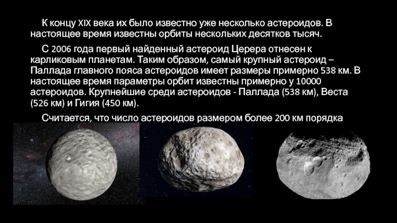 первый найденный астероид Церера отнесен к карликовым планетам. Таким образом, самый крупный астероид – Паллада главного пояса астероидов имеет размеры примерно 538 км. В настоящее время параметры орбит известны примерно у 10000 астероидов. Крупнейшие среди астероидов - Паллада (538 км), Веста (526 км) и Гигия (450 км).