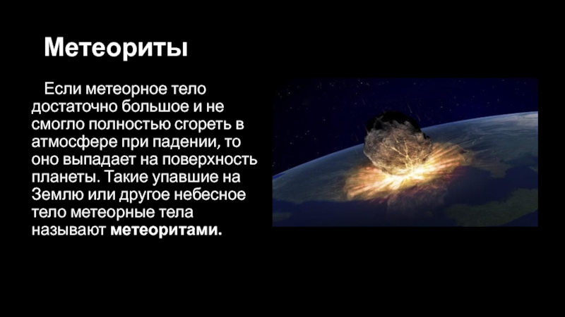 Такие упавшие на Землю или другое небесное тело метеорные тела называют метеоритами.