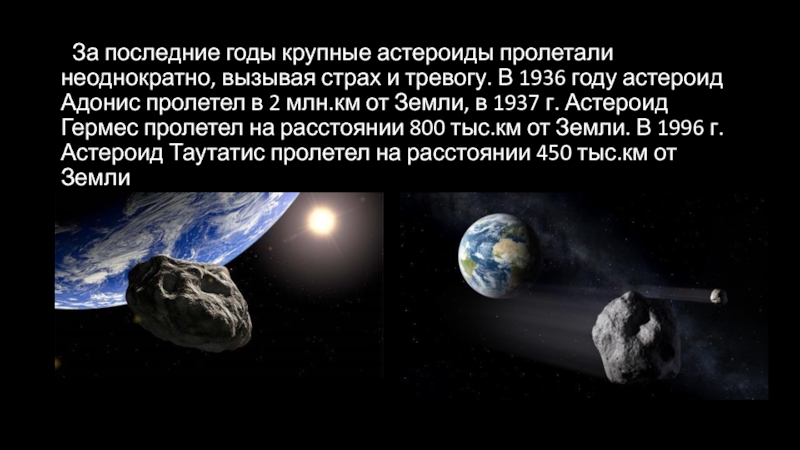 Слайд 8За последние годы крупные астероиды пролетали неоднократно, вызывая страх и