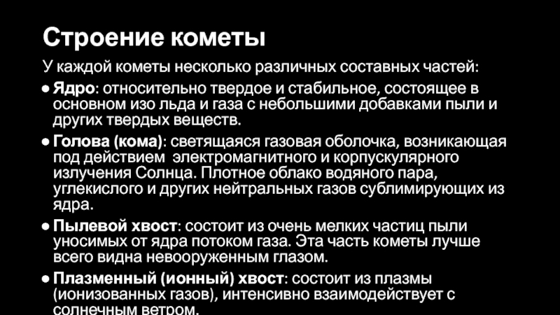 Плазменный (ионный) хвост: состоит из плазмы (ионизованных газов), интенсивно взаимодействует с солнечным ветром.