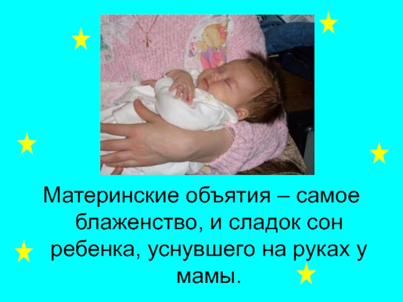 Слайд 16Материнские объятия – самое блаженство, и сладок сон ребенка, уснувшего