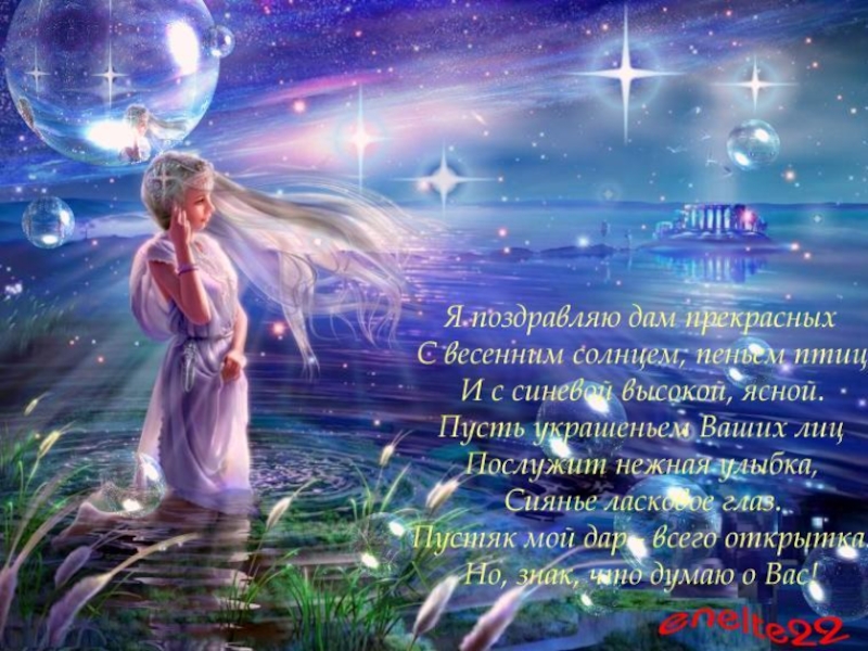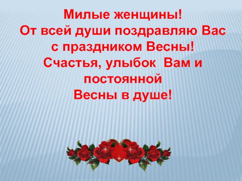 Милые женщины!От всей души поздравляю Вас с праздником Весны!Счастья, улыбок Вам и постояннойВесны в душе!