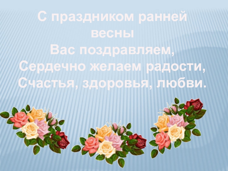С праздником ранней весныВас поздравляем,Сердечно желаем радости,Счастья, здоровья, любви.