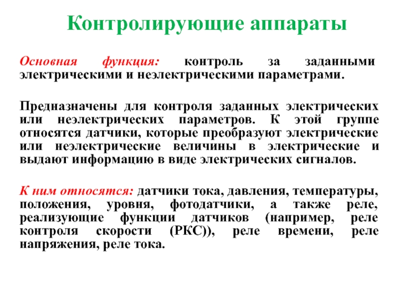 К ним относятся: датчики тока, давления, температуры, положения, уровня, фотодатчики, а также реле, реализующие функции датчиков (например, реле контроля скорости (РКС)), реле времени, реле напряжения, реле тока.