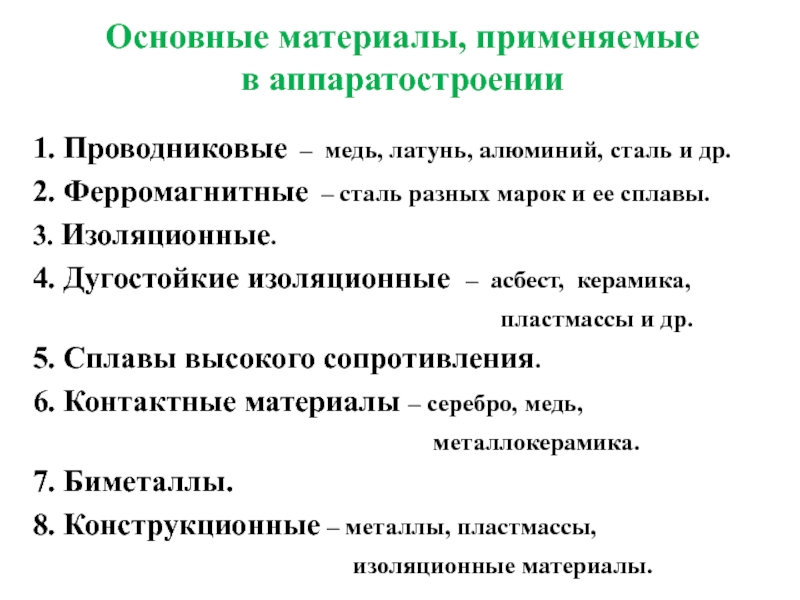 1. Проводниковые – медь, латунь, алюминий,