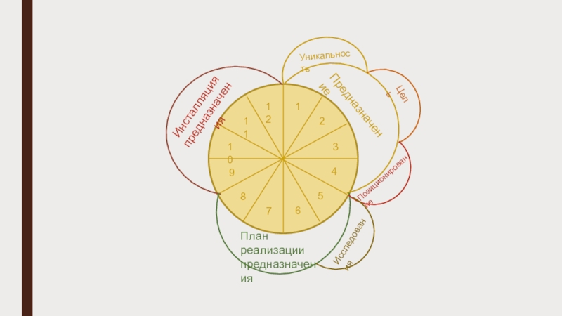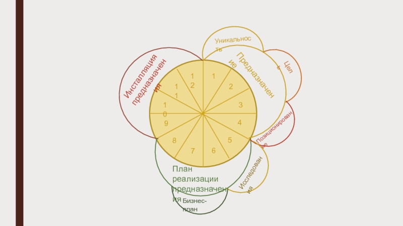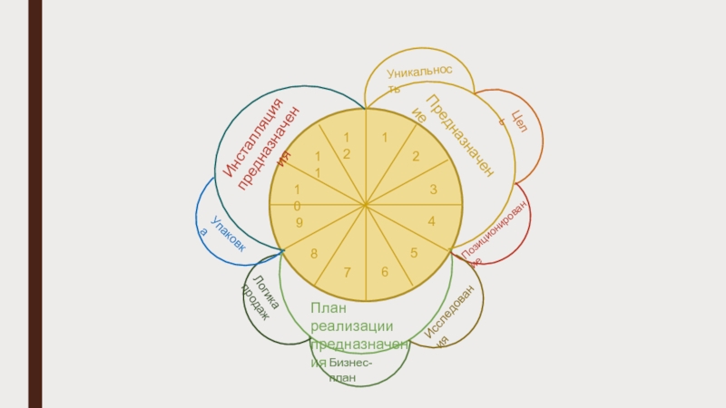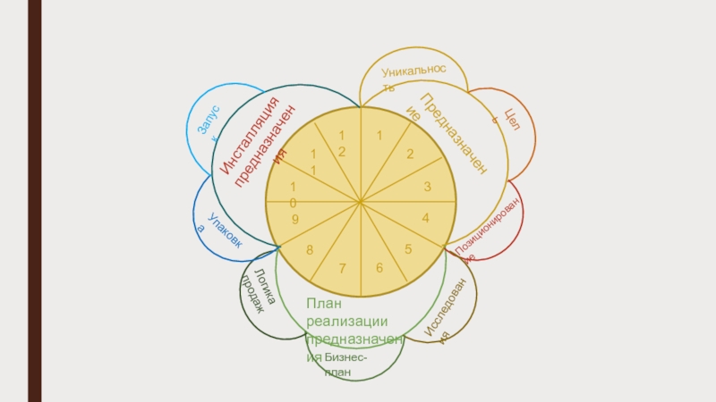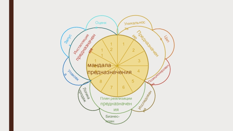 123456789111210ПредназначениеПлан реализации предназначенияИнсталляция предназначенияЦельУникальностьИсследованияБизнес-планЛогика продажУпаковкаЗапускОценкамандала предназначенияПозиционирование