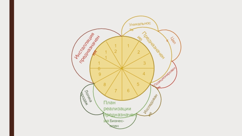 123456789111210ПредназначениеПлан реализации предназначенияИнсталляция предназначенияЦельУникальностьИсследованияБизнес-планЛогика продажПозиционирование