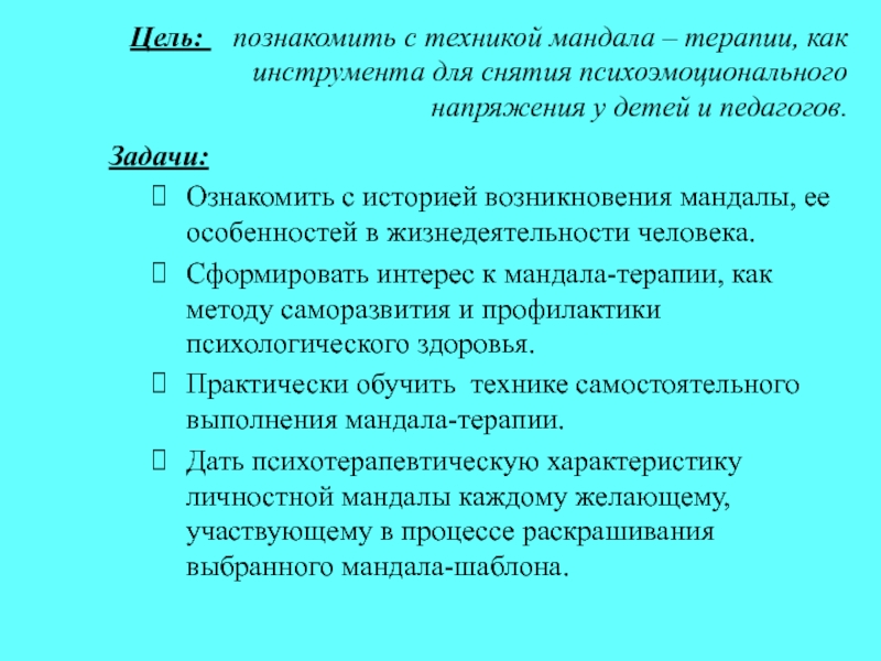 Слайд 2Цель: познакомить с техникой мандала – терапии, как инструмента