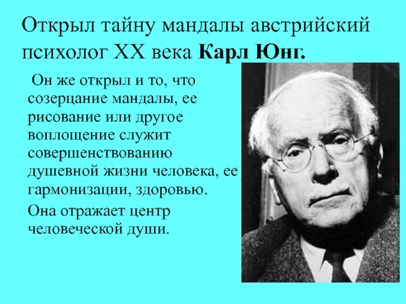 Слайд 12Открыл тайну мандалы австрийский психолог XX века Карл Юнг.