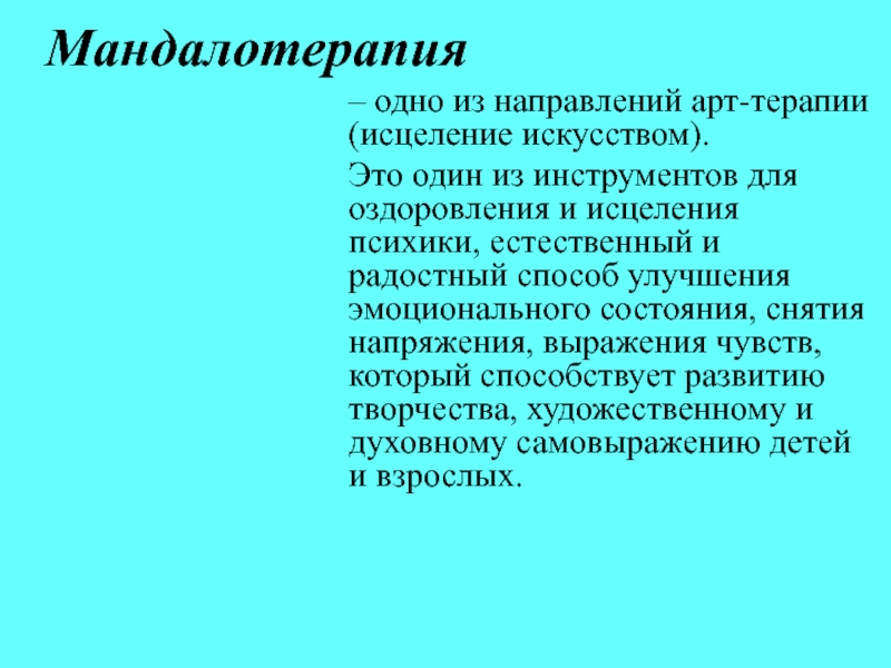 улучшения эмоционального состояния, снятия напряжения, выражения чувств, который способствует развитию творчества, художественному и духовному самовыражению детей и взрослых.