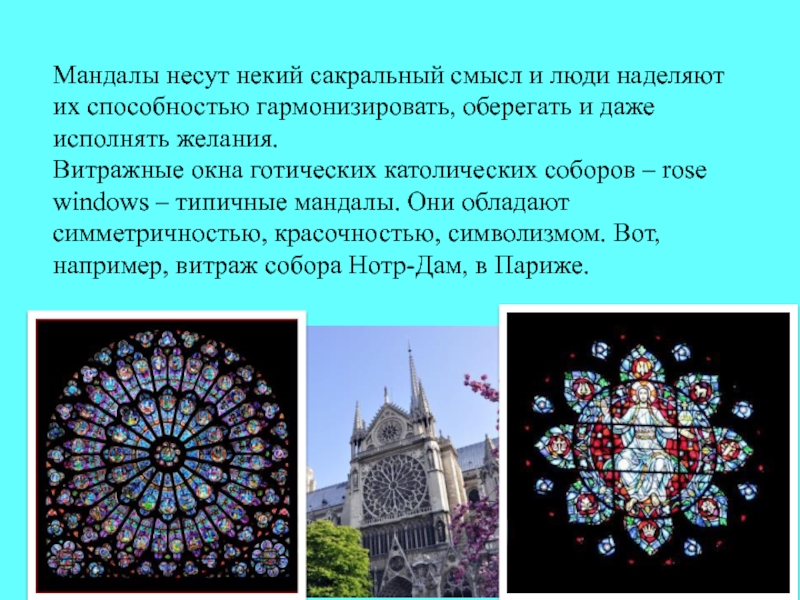 rose windows – типичные мандалы. Они обладают симметричностью, красочностью, символизмом. Вот, например, витраж собора Нотр-Дам, в Париже.