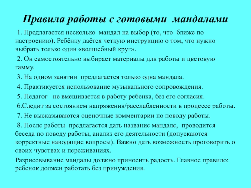 Разрисовывание мандалы должно приносить радость. Главное правило: ребенок должен работать без принуждения.