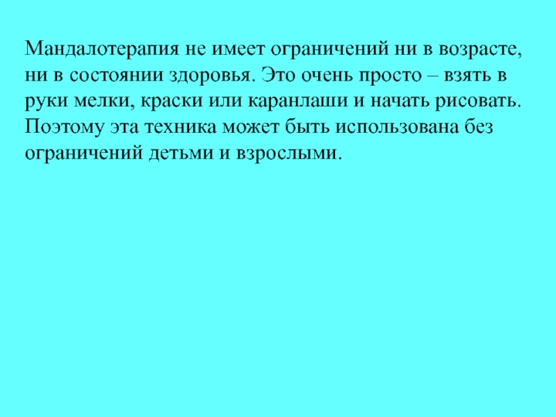 Слайд 14Мандалотерапия не имеет ограничений ни в возрасте, ни в состоянии здоровья.
