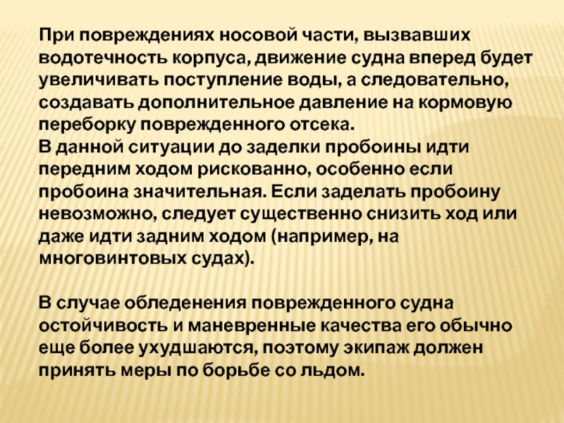 Слайд 3При повреждениях носовой части, вызвавших водотечность корпуса, движение судна вперед