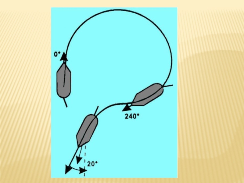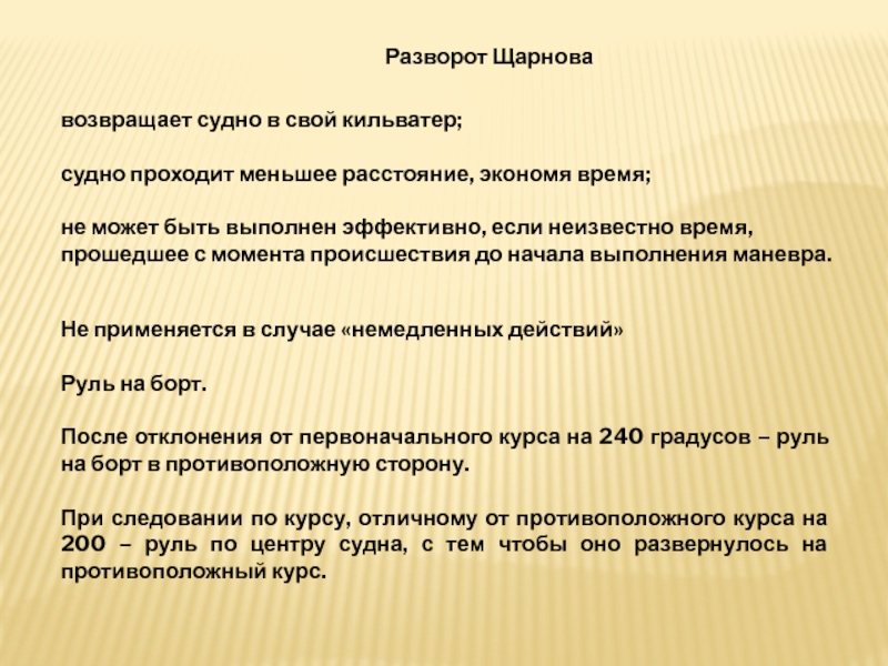 При следовании по курсу, отличному от противоположного курса на 200 – руль по центру судна, с тем чтобы оно развернулось на противоположный курс.