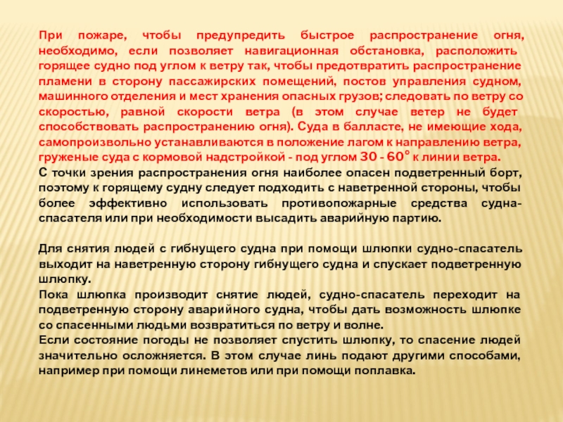 С точки зрения распространения огня наиболее опасен подветренный борт, поэтому к горящему судну следует подходить с наветренной стороны, чтобы более эффективно использовать противопожарные средства судна-спасателя или при необходимости высадить аварийную партию.
