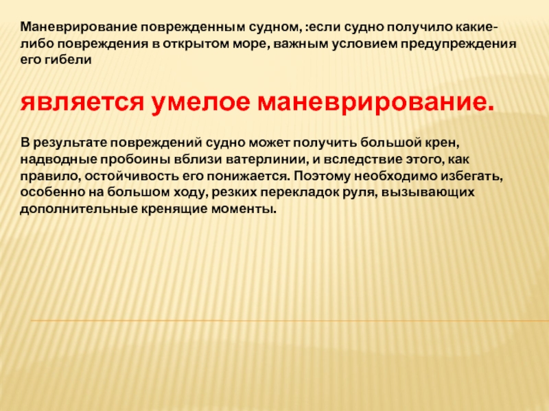 Слайд 2Маневрирование поврежденным судном, :если судно получило какие-либо повреждения в открытом