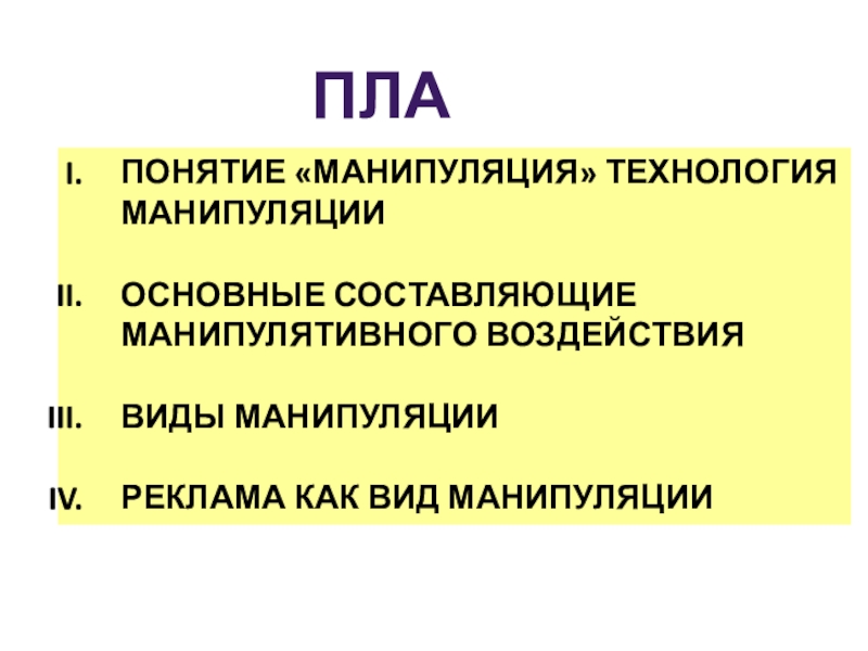 планПонятие «манипуляция» технология манипуляцииОсновные составляющие манипулятивного воздействияВиды манипуляцииРеклама как вид манипуляции