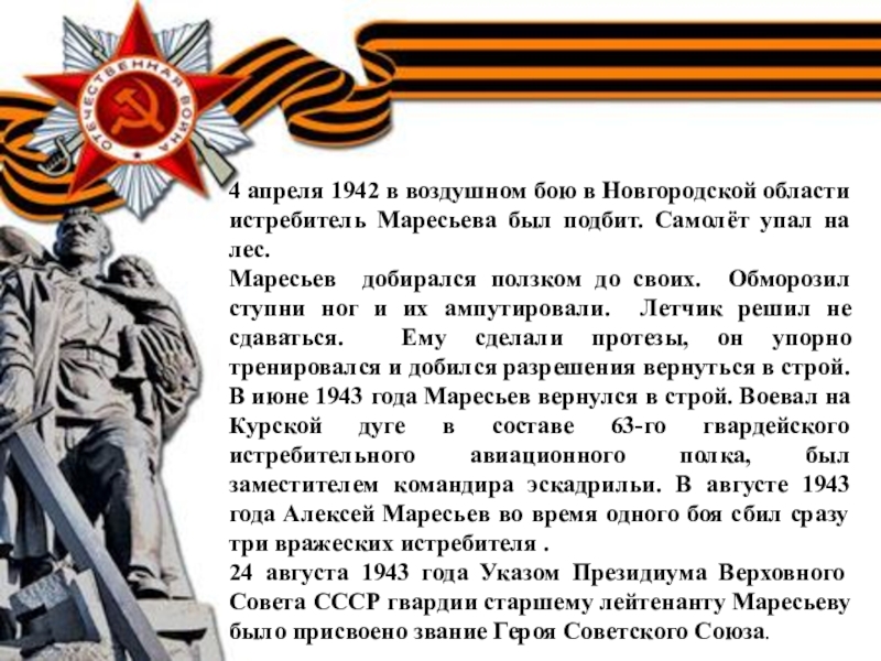 24 августа 1943 года Указом Президиума Верховного Совета СССР гвардии старшему лейтенанту Маресьеву было присвоено звание Героя Советского Союза.