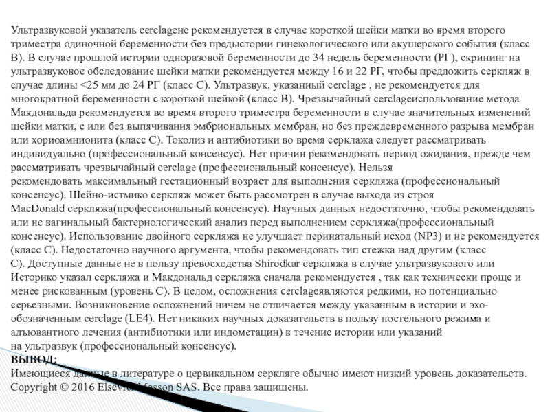 (класс B). В случае прошлой истории одноразовой беременности до 34 недель беременности (РГ), скрининг на ультразвуковое обследование шейки матки рекомендуется между 16 и 22 РГ, чтобы предложить серкляж в случае длины <25 мм до 24 РГ (класс С). Ультразвук, указанный cerclage , не рекомендуется для многократной беременности с короткой шейкой (класс B). Чрезвычайный cerclageиспользование метода Макдональда рекомендуется во время второго триместра беременности в случае значительных изменений шейки матки, с или без выпячивания эмбриональных мембран, но без преждевременного разрыва мембран или хориоамнионита (класс С). Токолиз и антибиотики во время серклажа следует рассматривать индивидуально (профессиональный консенсус). Нет причин рекомендовать период ожидания, прежде чем рассматривать чрезвычайный cerclage (профессиональный консенсус). Нельзя рекомендовать максимальный гестационный возраст для выполнения серкляжа (профессиональный консенсус). Шейно-истмико серкляж может быть рассмотрен в случае выхода из строя MacDonald серкляжа(профессиональный консенсус). Научных данных недостаточно, чтобы рекомендовать или не вагинальный бактериологический анализ перед выполнением серкляжа(профессиональный консенсус). Использование двойного серкляжа не улучшает перинатальный исход (NP3) и не рекомендуется (класс C). Недостаточно научного аргумента, чтобы рекомендовать тип стежка над другим (класс C). Доступные данные не в пользу превосходства Shirodkar серкляжа в случае ультразвукового или Историко указал серкляжа и Макдональд серкляжа сначала рекомендуется , так как технически проще и менее рискованным (уровень С). В целом, осложнения cerclageявляются редкими, но потенциально серьезными. Возникновение осложнений ничем не отличается между указанным в истории и эхо-обозначенным cerclage (LE4). Нет никаких научных доказательств в пользу постельного режима и адъювантного лечения (антибиотики или индометацин) в течение истории или указаний на ультразвук (профессиональный консенсус).
