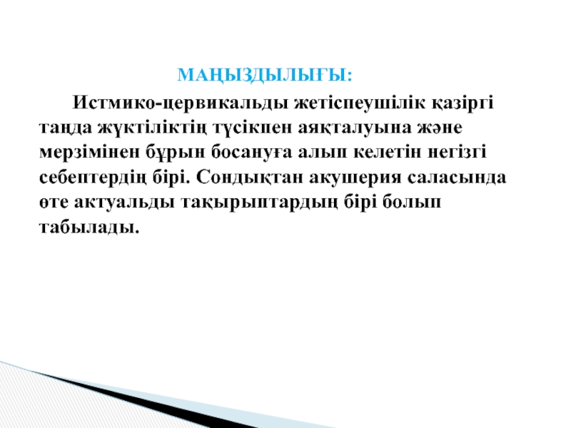 Истмико-цервикальды жетіспеушілік қазіргі таңда жүктіліктің түсікпен аяқталуына және мерзімінен бұрын босануға алып келетін негізгі себептердің бірі. Сондықтан акушерия саласында өте актуальды тақырыптардың бірі болып табылады.
