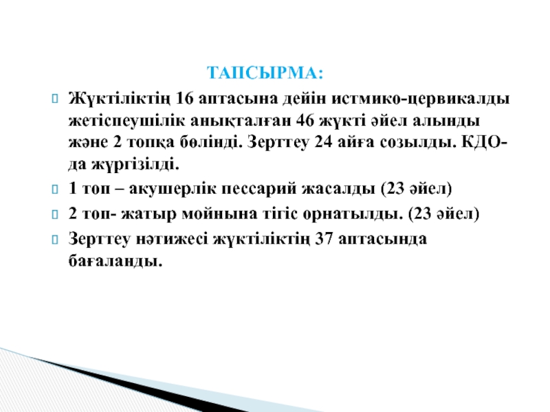 аптасына дейін истмико-цервикалды жетіспеушілік анықталған 46 жүкті әйел алынды және 2 топқа бөлінді. Зерттеу 24 айға созылды. КДО-да жүргізілді.