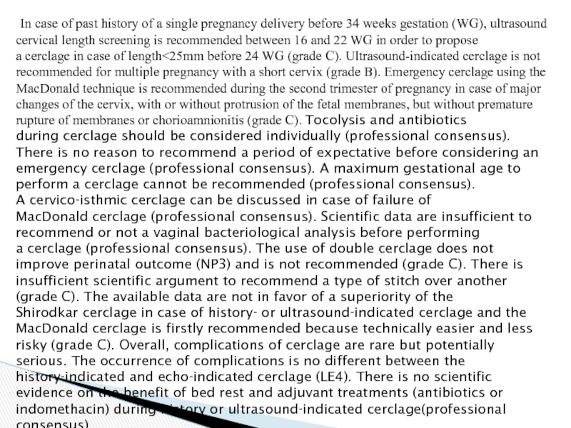 recommended between 16 and 22 WG in order to propose a cerclage in case of length<25mm before 24 WG (grade C). Ultrasound-indicated cerclage is not recommended for multiple pregnancy with a short cervix (grade B). Emergency cerclage using the MacDonald technique is recommended during the second trimester of pregnancy in case of major changes of the cervix, with or without protrusion of the fetal membranes, but without premature rupture of membranes or chorioamnionitis (grade C). Tocolysis and antibiotics during cerclage should be considered individually (professional consensus). There is no reason to recommend a period of expectative before considering an emergency cerclage (professional consensus). A maximum gestational age to perform a cerclage cannot be recommended (professional consensus). A cervico-isthmic cerclage can be discussed in case of failure of MacDonald cerclage (professional consensus). Scientific data are insufficient to recommend or not a vaginal bacteriological analysis before performing a cerclage (professional consensus). The use of double cerclage does not improve perinatal outcome (NP3) and is not recommended (grade C). There is insufficient scientific argument to recommend a type of stitch over another (grade C). The available data are not in favor of a superiority of the Shirodkar cerclage in case of history- or ultrasound-indicated cerclage and the MacDonald cerclage is firstly recommended because technically easier and less risky (grade C). Overall, complications of cerclage are rare but potentially serious. The occurrence of complications is no different between the history-indicated and echo-indicated cerclage (LE4). There is no scientific evidence on the benefit of bed rest and adjuvant treatments (antibiotics or indomethacin) during history or ultrasound-indicated cerclage(professional consensus).