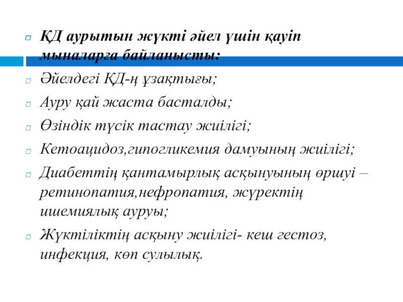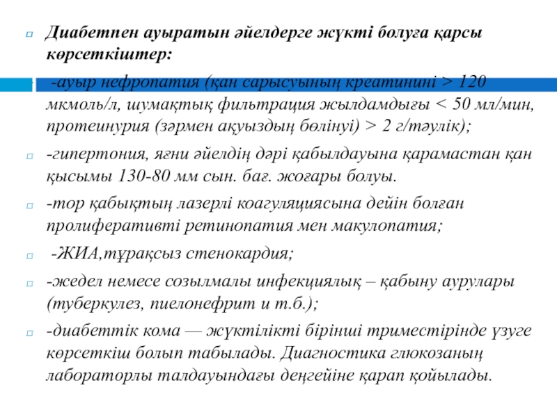 Слайд 10Диабетпен ауыратын әйелдерге жүкті болуға қарсы көрсеткіштер: