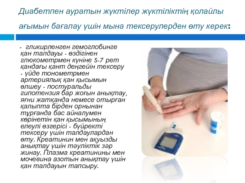 Слайд 12Диабетпен ауратын жүктілер жүктіліктің қолайлы ағымын бағалау үшін мына тексерулерден
