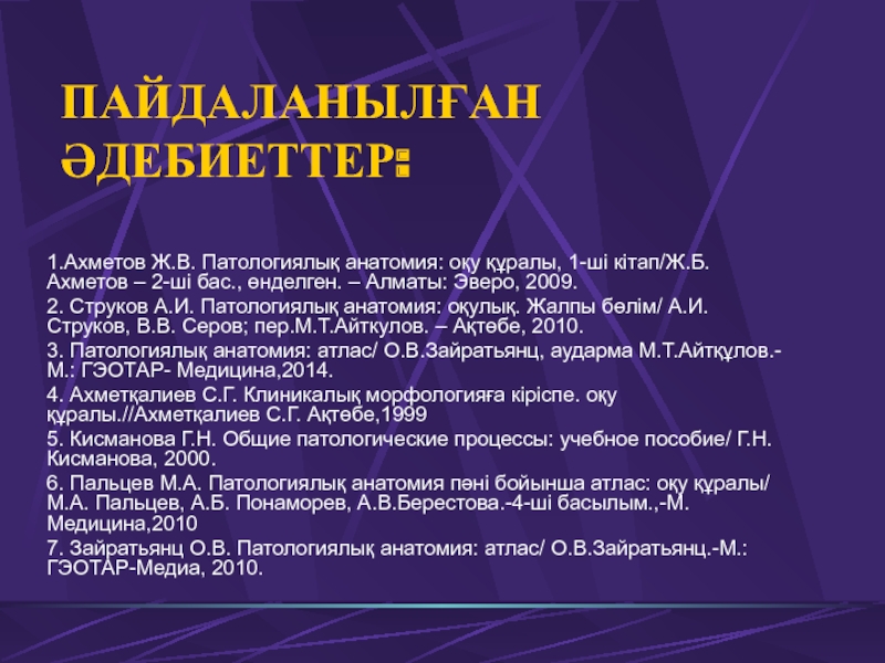 7. Зайратьянц О.В. Патологиялық анатомия: атлас/ О.В.Зайратьянц.-М.:ГЭОТАР-Медиа, 2010.