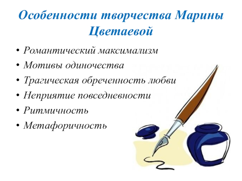 Особенности творчества Марины Цветаевой Романтический максимализмМотивы одиночества Трагическая обреченность любвиНеприятие повседневности Ритмичность Метафоричность